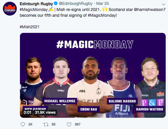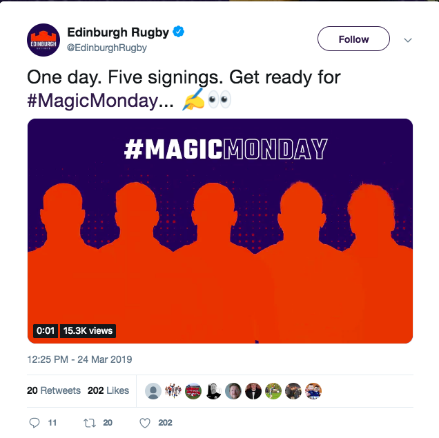 As a fan of Edinburgh rugby this was especially intrigued by this as it meant 5 new singings would take place in the club bringing me to their social media channels 7 times during the day just to check if the next player had been announced. With that said social media have been increasingly used by sports organisations to communicate with the public (Wang & Zhou 2015). This communication tool from Edinburgh also created a major talking point as a key aim of theirs was to try and sell as many tickets to their first home European quarter final game in over 10 years. 5 days after magic Monday took place